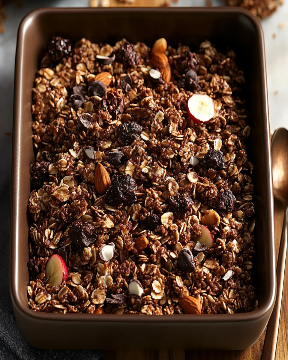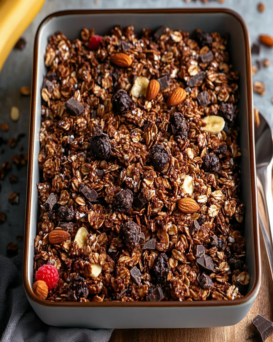 In summary, this Crunchy Chocolate Granola is a delightful and nutritious way to start your day. Not only is it easy to prepare, but it also offers a versatile base that can be customized to your liking. Whether you enjoy it with yogurt, milk, or on its own, this granola is a satisfying option that combines flavor and health in every bite.