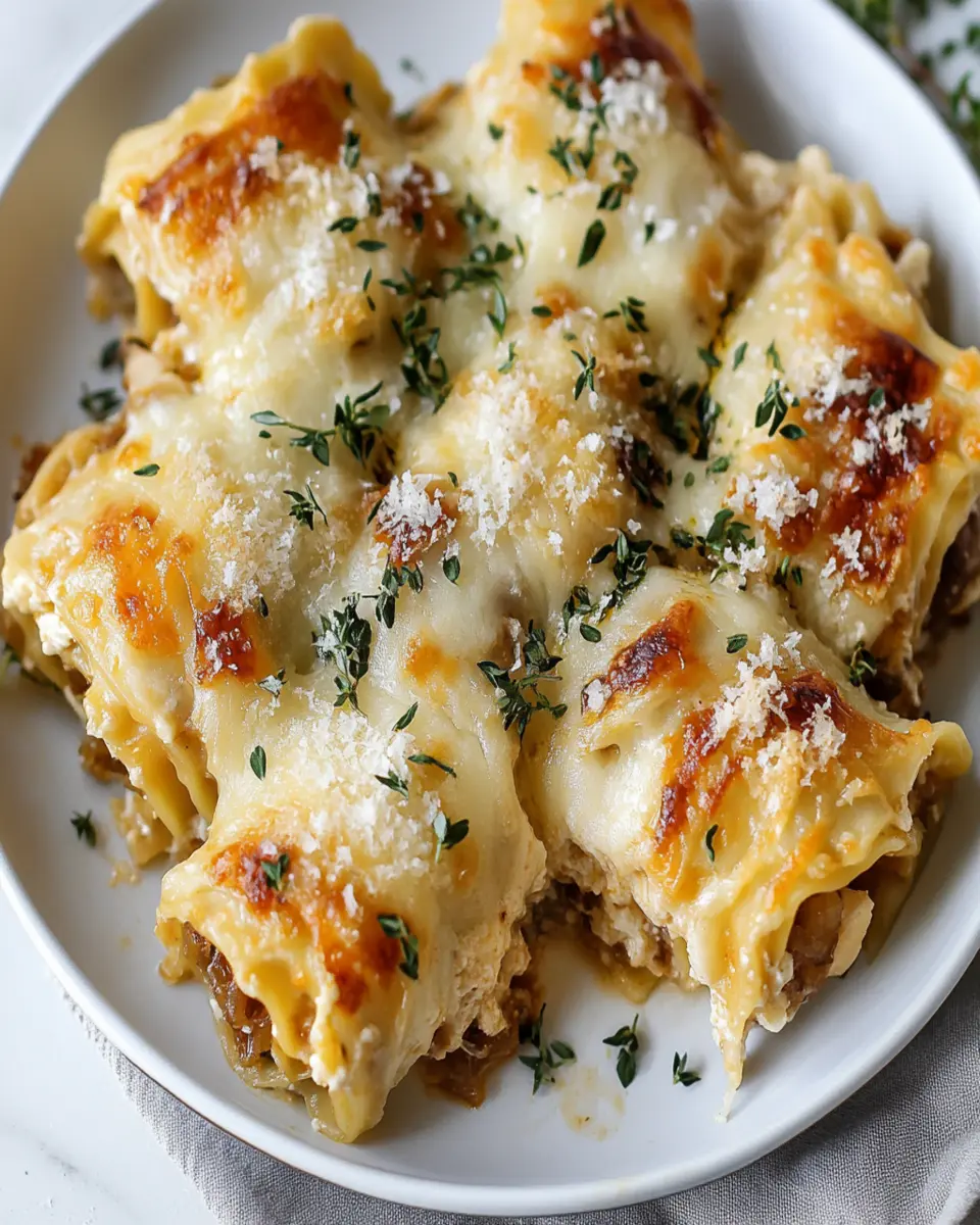 Indulge in a comforting twist on classic lasagna with these French Onion Chicken Lasagna Roll Ups, combining rich flavors of caramelized onions and tender chicken.
