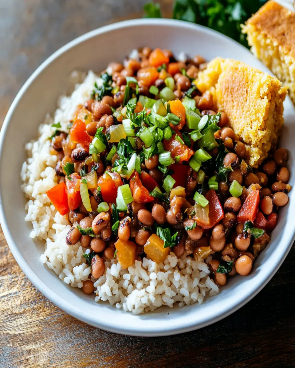 Hoppin’ John is a traditional Southern dish made primarily with black-eyed peas and rice, often seasoned with spices and sometimes meat. It is famously served on New Year’s Day to bring good luck for the year ahead.