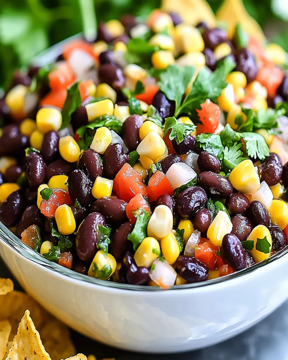 A delicious and vibrant dip perfect for any party, made with black beans, corn, tomatoes, and a zesty dressing.