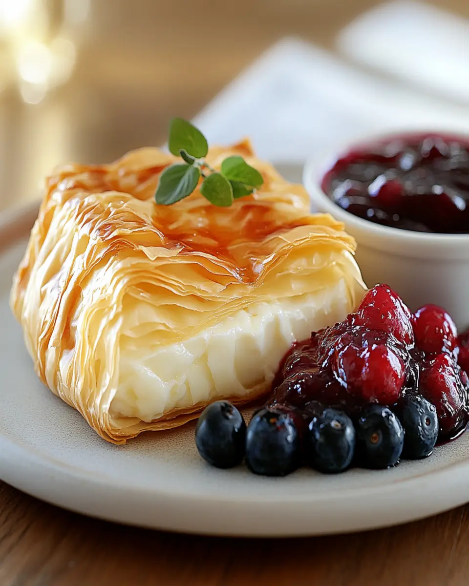 This dish can be prepared ahead of time, allowing you to enjoy the moment with friends and family without the stress of last-minute cooking. Whether served with crackers, fresh fruit, or a drizzle of honey, Phyllo-Wrapped Brie is versatile enough to fit any occasion.
