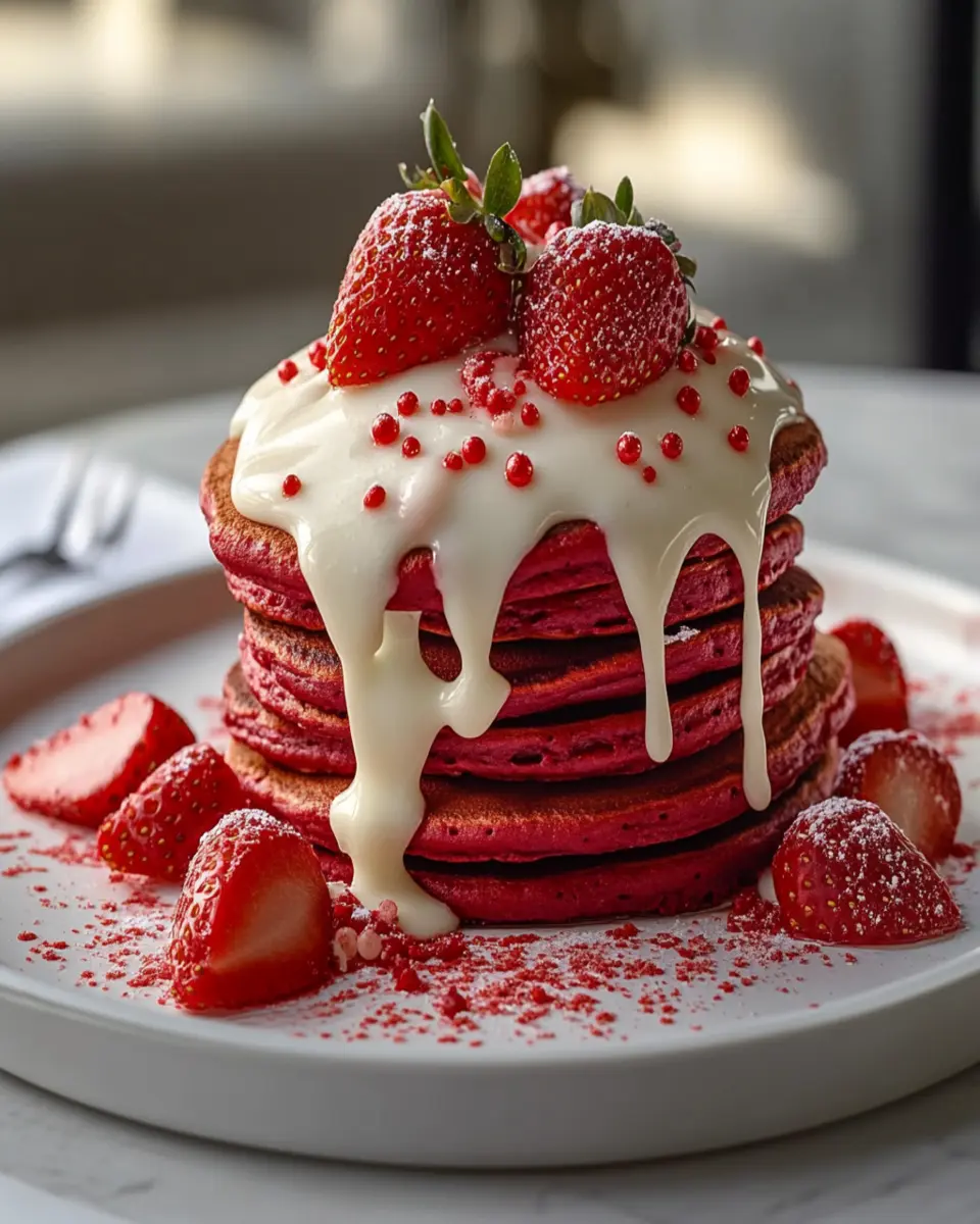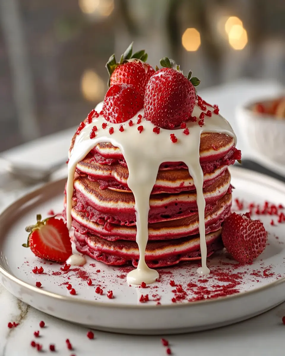 Red velvet pancakes are delicious on their own, but they pair wonderfully with toppings like cream cheese frosting, fresh berries, whipped cream, or a drizzle of maple syrup. These additions enhance the sweetness and create a delightful presentation.