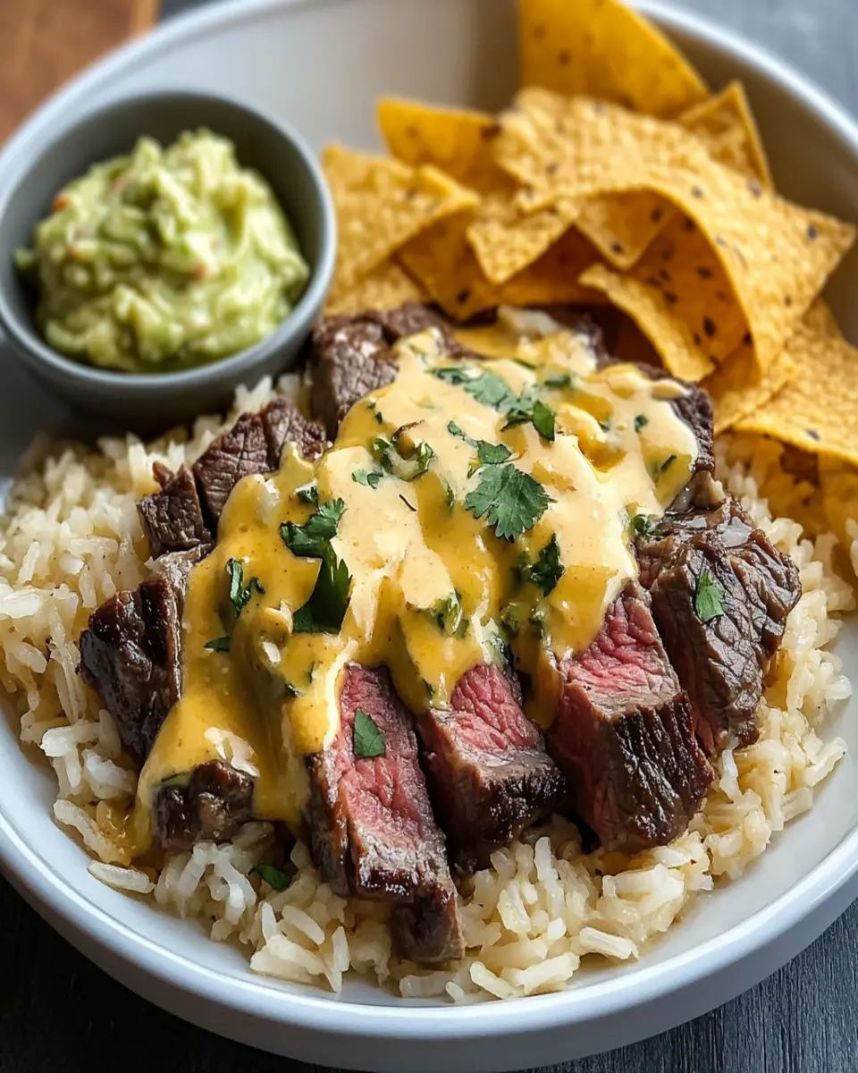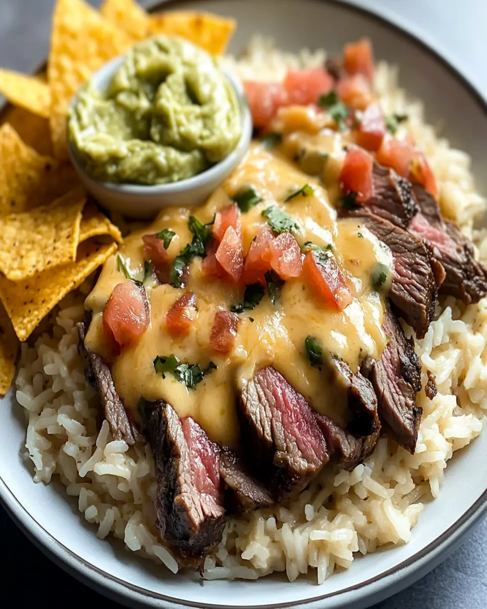 Not only is it hearty, but it’s also packed with protein and fiber, making it a nutritious option that doesn’t skimp on flavor. The combination of textures—from the tender steak to the creamy queso and fluffy rice—creates a satisfying experience in every bite. You’ll find that this recipe not only nourishes your body but also warms your soul, making it a go-to meal for any occasion.