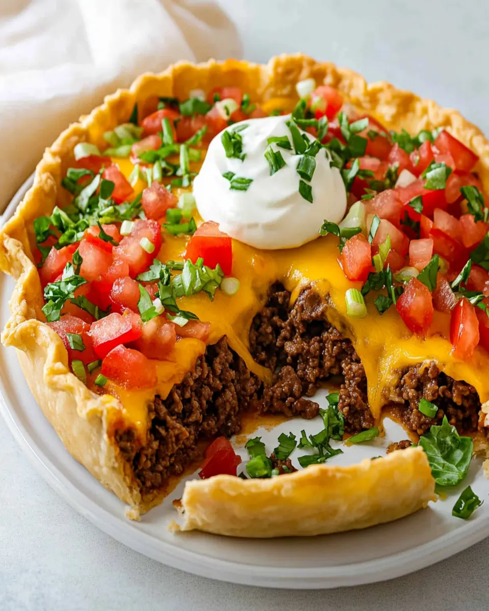 Taco Pie is not just a meal; it’s an experience. It’s surprisingly simple to make, appealing to both adults and children alike. Imagine a savory filling of seasoned ground beef mixed with juicy tomatoes, all enveloped in a golden pie crust. Each slice is a burst of flavor, topped with creamy sour cream, crisp lettuce, and crunchy green onions. It’s a dish that can easily become a family favorite, offering a satisfying combination of textures and tastes.