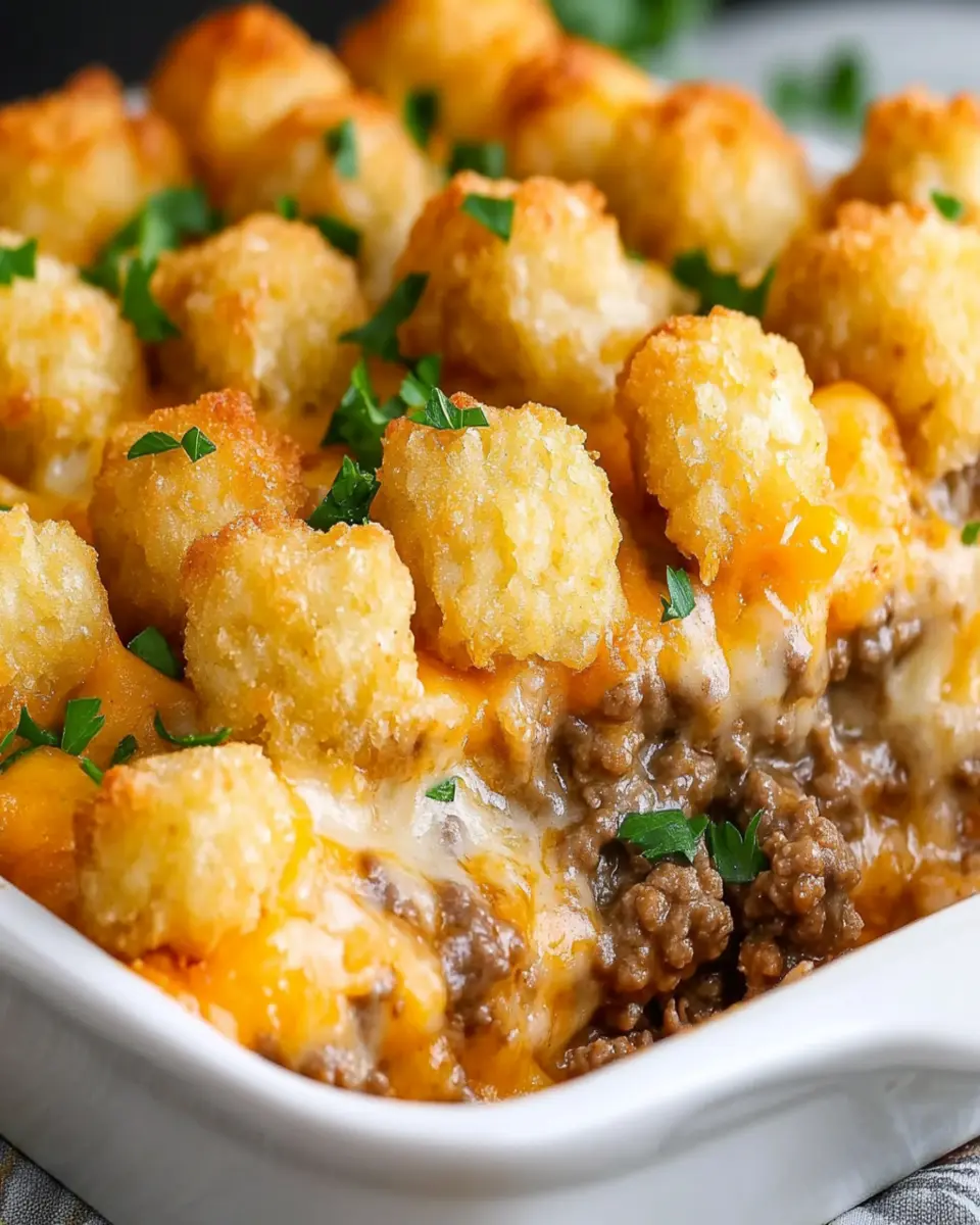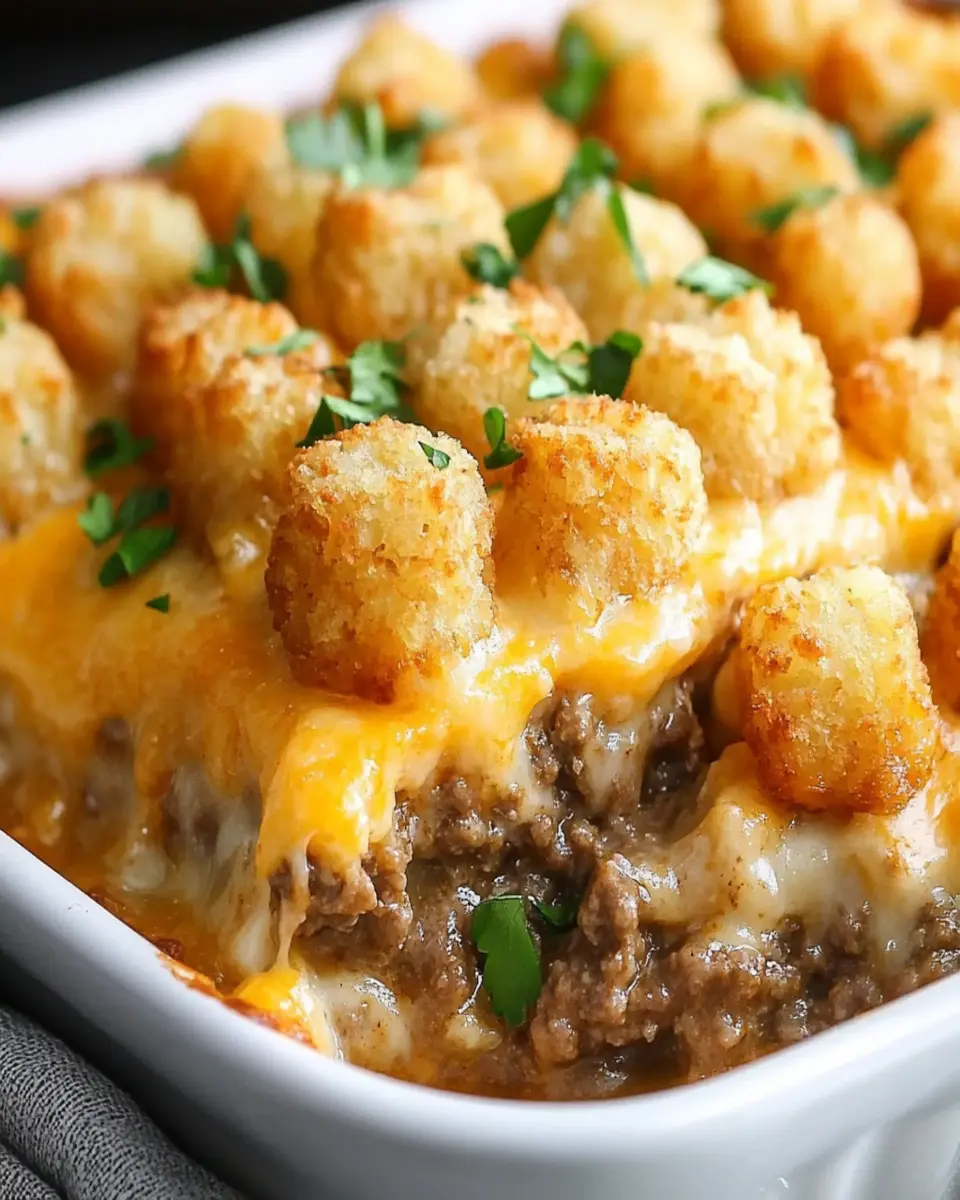 A comforting and hearty tater tot casserole featuring ground beef, creamy soup, and crispy tater tots.